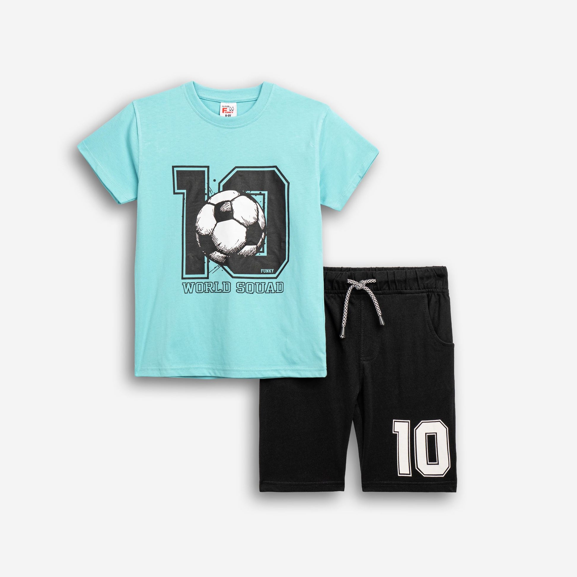 Σετ μακό για αγόρι 6 έως 16 ετών με κοντομάνικη μπλούζα σε χρώμα τιρκουάζ με τύπωμα και μαύρη βερμούδα με τύπωμα , με λάστιχο και κορδόνι. Ποιότητα 100% cotton.